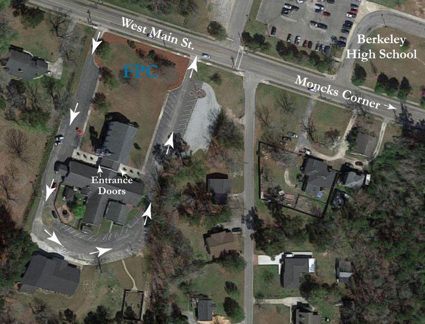 Take Highway 17A north to Moncks Corner. Turn left on East Main Street and First Presbyterian Church will be on the left just past Berkeley High School.